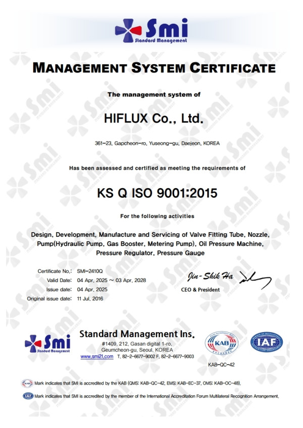 認証範囲 : バルブ、フィッティング、チューブ、ノズル、ポンプ(水圧ポンプ、ガス、ブースター、定量ポンプ)、油圧機器、圧力調整器、圧力計の設計、開発及び製造
